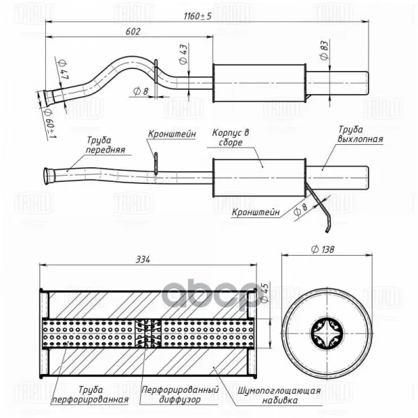 Глушитель для а/м Лада 1119 Kalina осн. прямоточный (алюм. сталь) (EMM 4009) T-Sport Trialli арт. EMM 4009