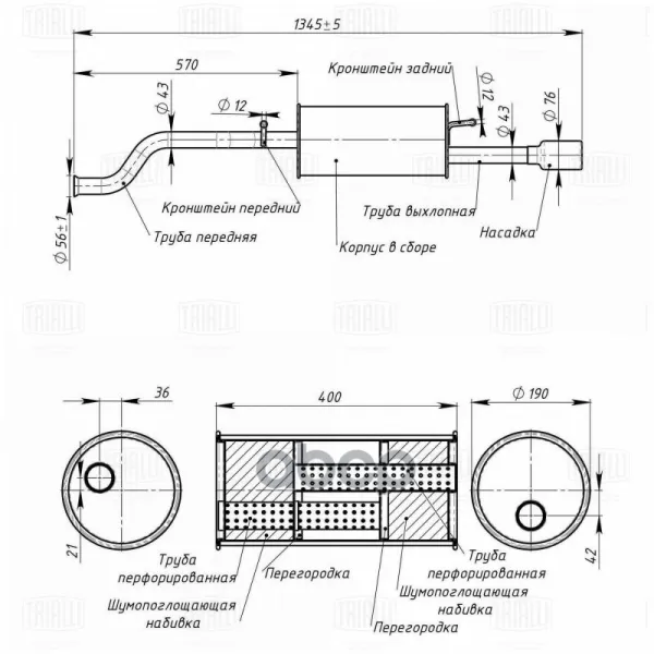 Глушитель для а/м Лада Vesta (15-) осн. (d трубы = 43) с насадкой (алюм. сталь) TRIALLI EMM 0125 Trialli арт. EMM 0125