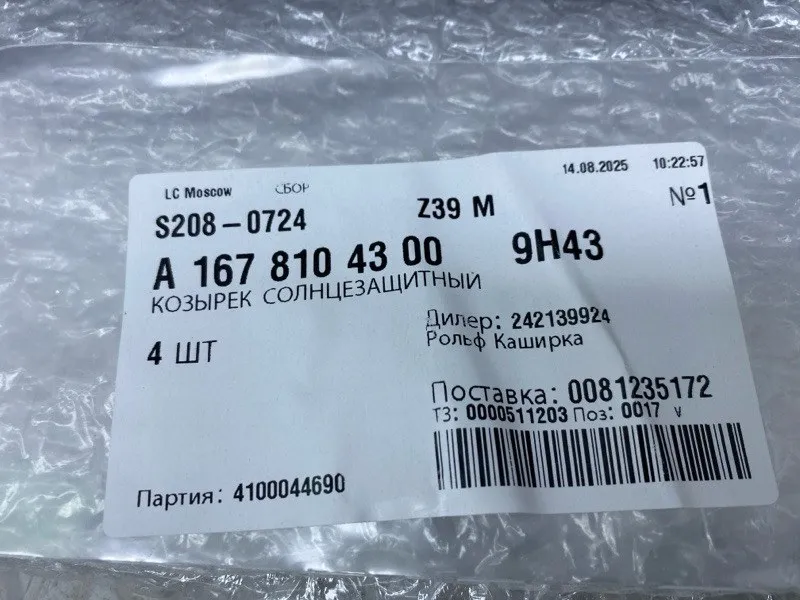 Козырек солнцезащитный Mercedes-Benz GLS 2024 A1678104300 X167 D656929, передний левый