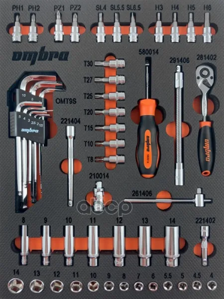 Набор инструментов 1/4inch головки 6гр, головки-биты, трещотка, удлинители, воротки, в ложементе, 54 пр. OMBRA арт. OMT54STE