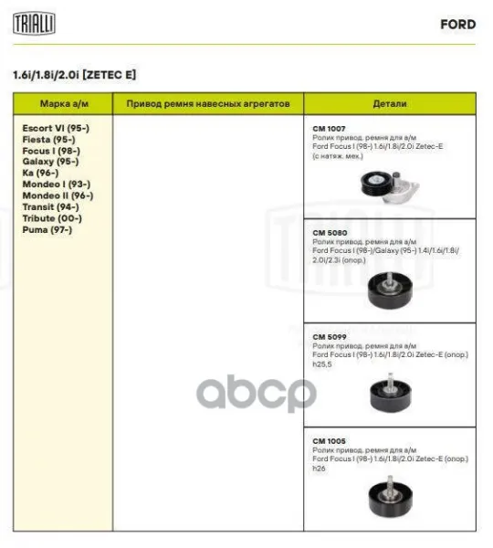 Ролик привод. ремня для а/м Ford Focus I (98-) 1.6i/1.8i/2.0i Zetec-E (с натяж. мех.) TRIALLI CM 1007 Trialli арт. CM 1007