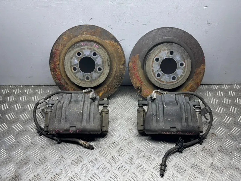 Комплект передних суппортов и дисков Chrysler 300C LD ( Крайслер 300C LD ). Дефект: скол на грани диска. Продается комплектом! Цена указана за комплект! Суппорта 2-х поршневые, диаметр дисков 345мм. Толщина 28мм.
